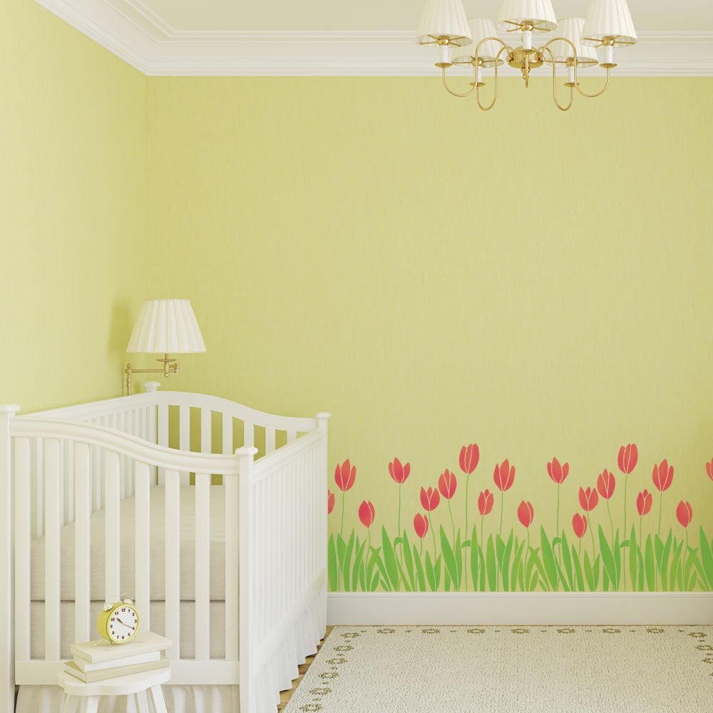 This Tulip Border stencil pattern looks great in nurseries and little girls rooms when stenciled above the baseboard. This pattern even looks fantastic in bathrooms and in hallways; it's great for softening the edge between floor and wall. Get creative and use different colors for the flower heads. Make sure to use a separate stencil brush for each color! You can stencil with acrylic or latex paints. The best base coat for stenciling is regular flat latex house paint. Perfect DIY nursery decorating project for beginners.
