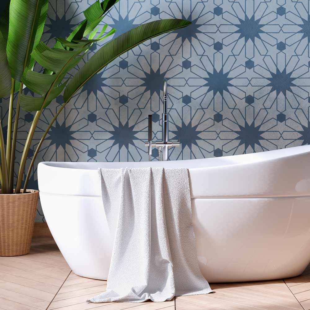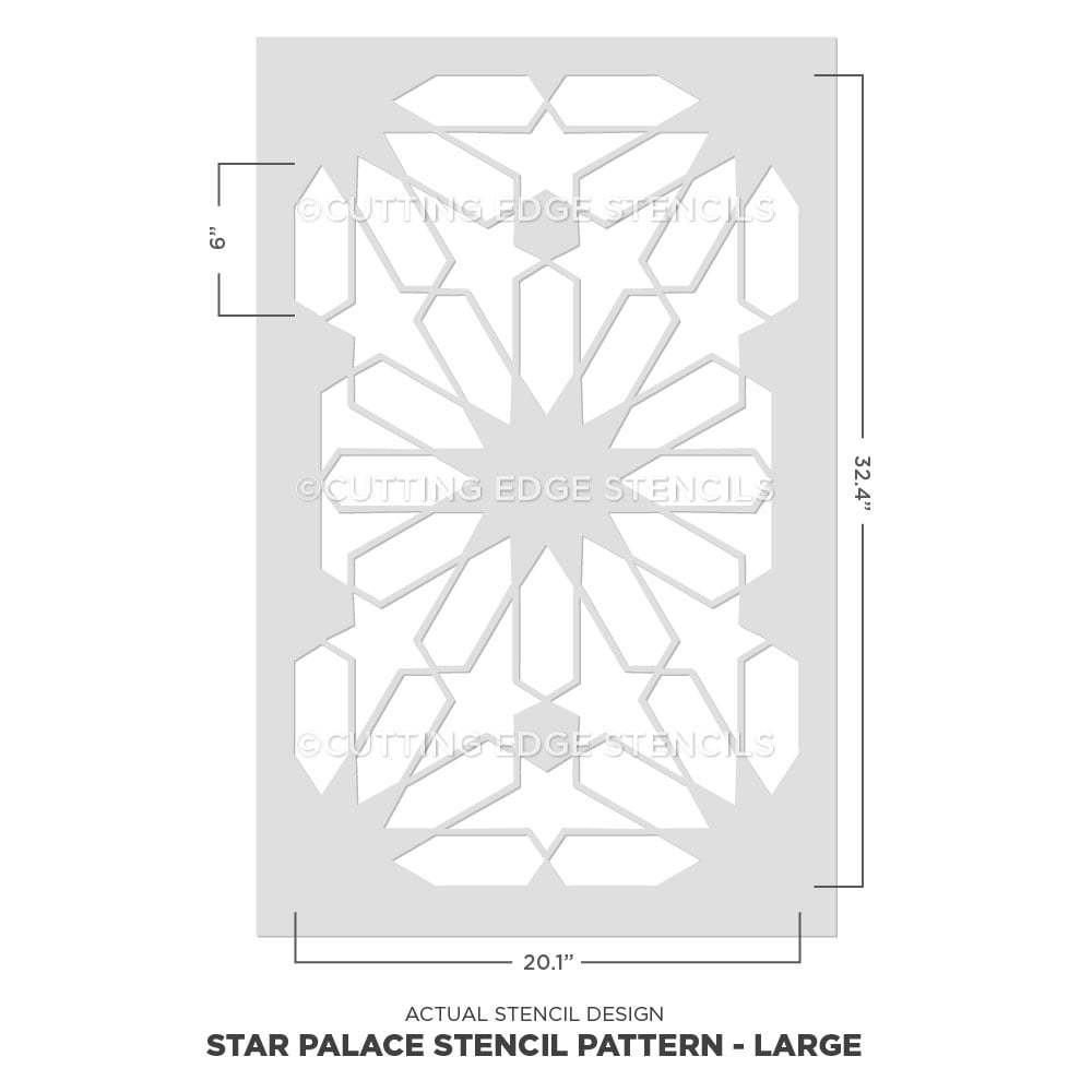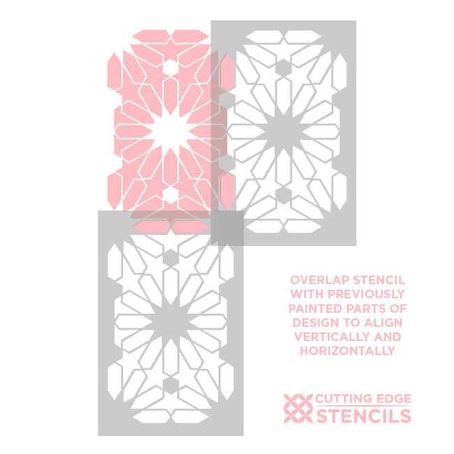 Your guests will be “star struck” once they see the Star Palace Stencil pattern in your home! This eye-catching star polygon pattern resembles authentic Moroccan tiles so closely, they won’t believe its faux tile. This geometric tile pattern looks fabulous on floors, walls, backsplashes, fireplaces, and even furniture! Dress up this tile stencil pattern with jewel tones for a sexy, bold look or tone it down with a muted palette for a subtle statement.