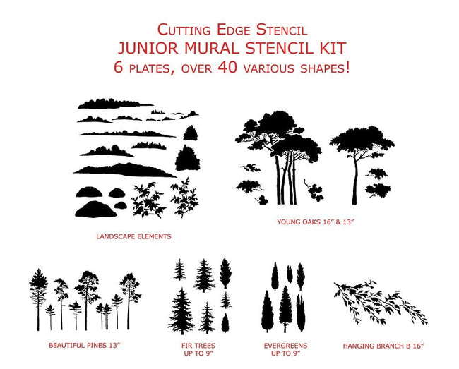 This Junior kit includes 6 stencil plates with over 40 mural stencil shapes and elements. Buy the Kit and save over 25% off the elements if purchased separately.