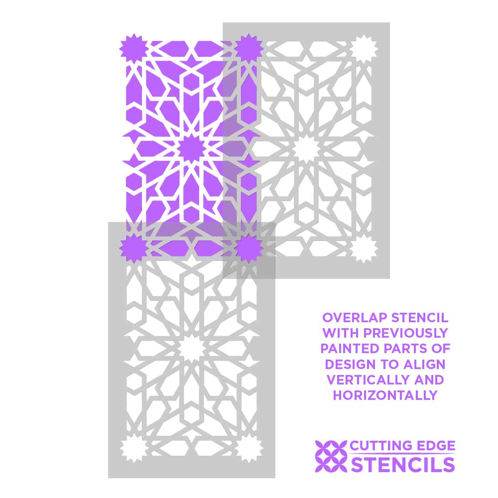 This Moroccan stencil features an easy registration system, just use parts of the previously painted design to align and lock in the stencil, check for level and continue. This gives you a seamless "wallpaper" look. Don't worry about super perfect alignment: in the end your eye will never ever notice the discrepancy.
