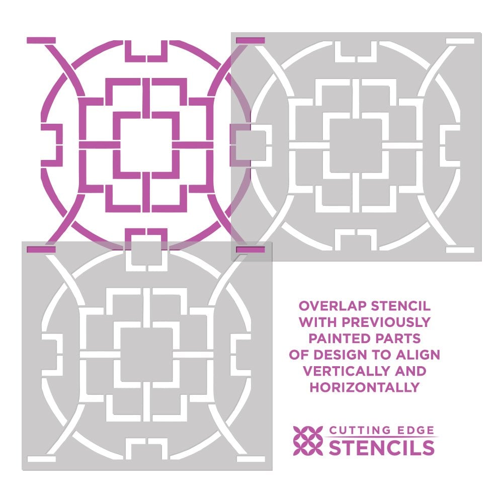 Stencil features an easy registration system, just use rows of the previously painted design to align the stencil, check for level and continue. This gives you a seamless "wallpaper" look. Don't worry about super perfect alignment: in the end your eye will never ever notice the discrepancy. We decorative pros "fudge" damasks and allover patterns all the time! The walls in most houses are often not straight, so some "fudging" while stenciling is very helpful and, in the end, not noticeable.