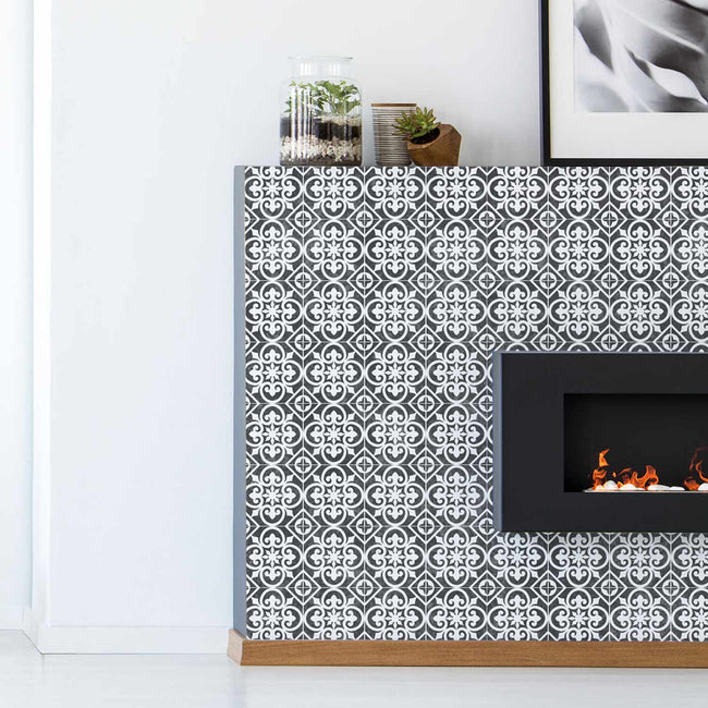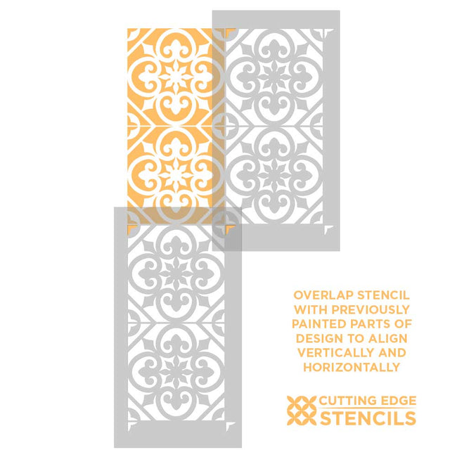 Our Granada Tile stencil is inspired by a classic Spanish encaustic cement tile design, which is both beautiful and timeless. This cement tile stencil is perfect for creating a gorgeous painted tile floor, kitchen tile backsplash, accent wall or even a tiled table top! With our tile stencils, you can create a dramatic tile floor on a budget and save big on bath and kitchen renovations! No need to rip out your old tile, as you can stencil right over it! Learn How to stencil a tile – it’s easy even for beginners!
