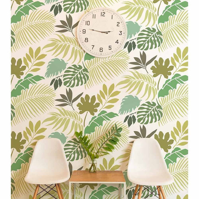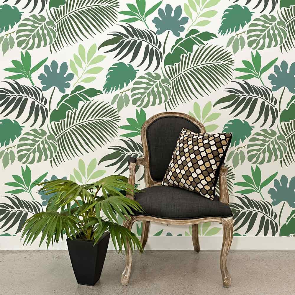 There is just a simple beauty in large palm leaves and all tropical leaves. So we have created a gorgeous foliage stencil pattern that capture that essence and perfectly follows tropical trends. Palm print wallpaper and tropical Hawaiian wallpaper are so popular, but installation can be a drag! And high price is also a deterrent. Our tropical stencil, with it's palm leaf pattern is a great wallpaper alternative and sure to add a little vacation to everyday!
