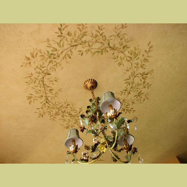 This versatile Citrus Leaves Stencil is a part of our Ultimate Faux Fresco Stencil Kit. It also can be purchased here separately. A wonderful way to stencil your fresco elements in a fraction of the time. Excellent for wall frescoes, fresco friezes and even fresco art panels.Use this versatile stencil to create a beautiful Leafy Wreath around a chandelier! Start by marking your circle with a piece of chalk on a string. Then hand paint wavy lines for your vines/branches using a liner brush. Lastly, stencil leaves for the full wreath effect. Easy, fast and breathtakingly beautiful!