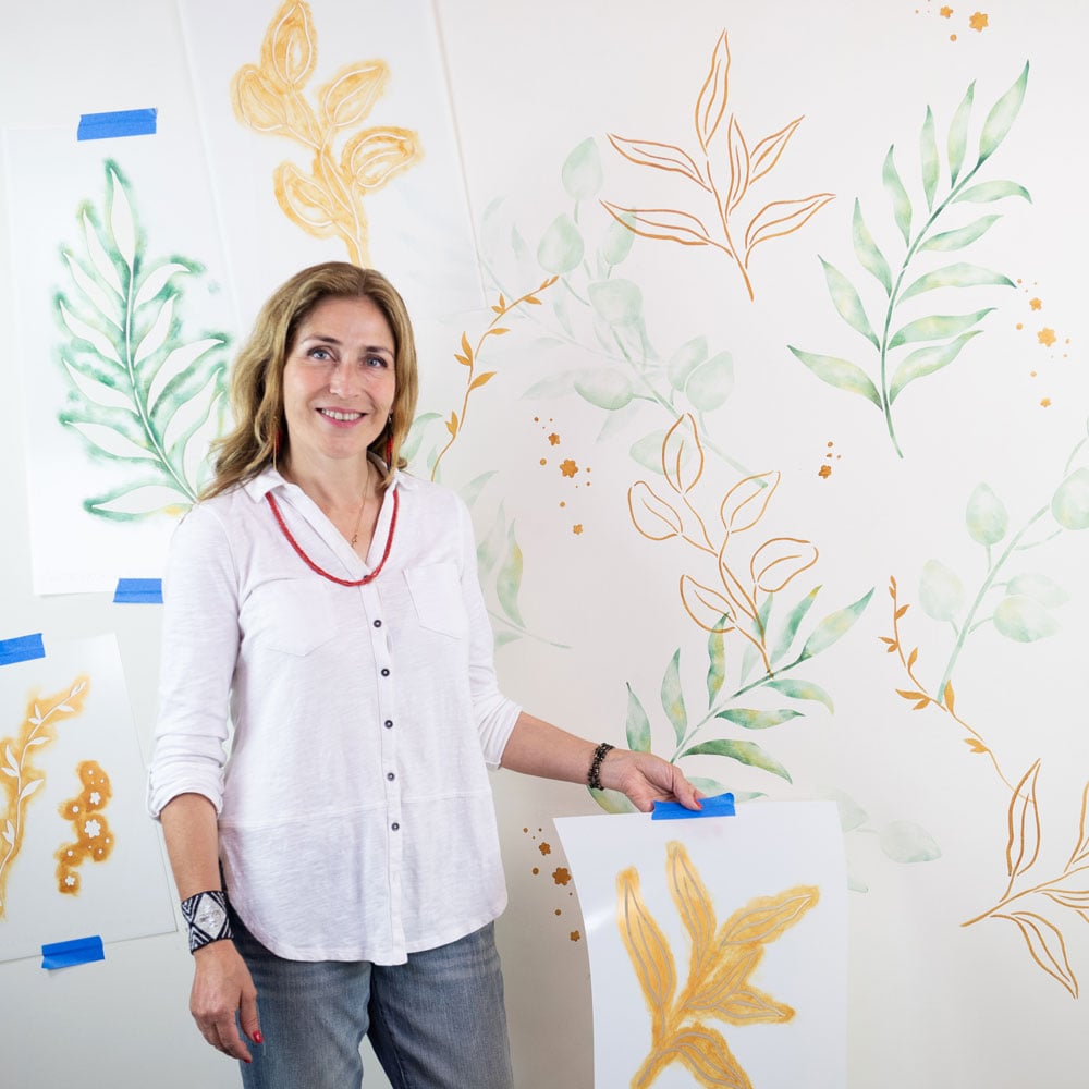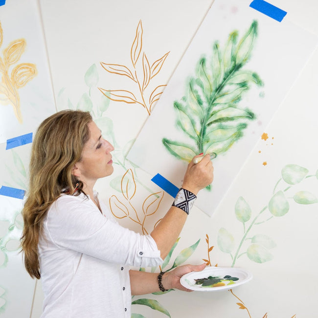 Lovely Eucaluptus Leaves stencils are so easy to apply! The faux watercolor technique is very simple and forgiving. The results are stunning, and the wall looks as if you’ve applied an expensive wallpaper. Place the leaf stencils by eye, tape them to the walls and paint using stencil brushes. Please watch the video where Janna shows the exact technique for this amazing finish.